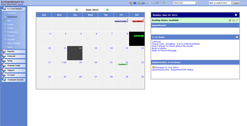 DJ Event Planner will change the way you manage and run your business, streamlining all your procedures and software into one easy to manage system. Our system makes it so all business types from sole traders to large multi employee operations can be up and running very quickly and efficiently. Best of all, there's no software to install and no backups to worry about! We manage all upgrades automatically and run daily backups so you don't have to!
