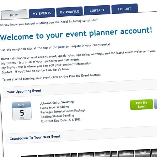 The portal allow your clients to log in to a fully branded and customizable area where they can view their event details, make changes if needed, update music requests, contact you, make payments, sign documents, and much more...